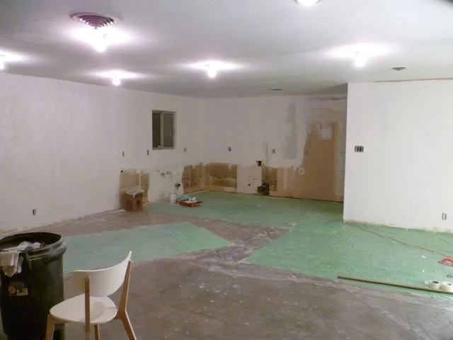 Hey, look at that big pile o' snazzy! It's not totally what it looks like though. That's actually primer, not "real" paint. My original intention was just to prime the ceiling in the kitchen area (i.e. the back left corner) to ready it for texture. But I figured while I was at it, I may as well prime the walls. You'll notice there are parts I skipped- those areas will be concealed by cabinets and/or the monolith monster refrigerator.