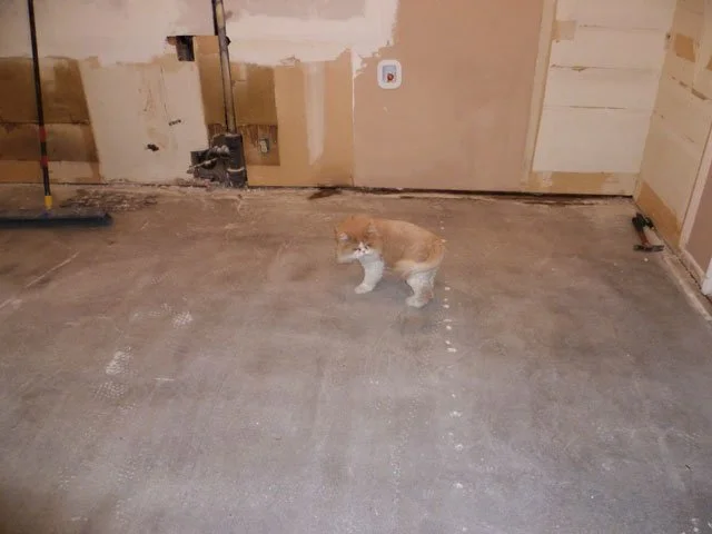 Probably doesn't look much different than the other photos I've been posting, but today the concrete guys did the "second cut". It's very smooth to the touch, and the little tiny stones are becoming visible. This is usually considered a good thing, but it depends on your taste and a zillion physical factors of how they mixed and poured the original concrete (and keep in mind they weren't originally doing it with cosmetics in mind). I'm OK with some of little stones showing, but I'm glad it's not going to be so exaggerated that it looks like a granite countertop. The only thing that scares me a bit is that there's a fairly large number of various divits and damage, mostly from carpet tack strips in the hall, foyer, etc., but they tell me they can fix all that up. Good news is that they're telling me that the entire slab is very even overall, and I'm told if it isn't, it doesn't look as nice when it's shiny. Tomorrow or the next day they'll start using the grinding wheels that make it shiny, so perhaps that'll show up in the pics (otherwise you're all going to have to come visit me here. Kegger!). Lester seems happy about the whole deal, and between the floor improvements and successfully locating his tail, it's a swell day for being a cat.