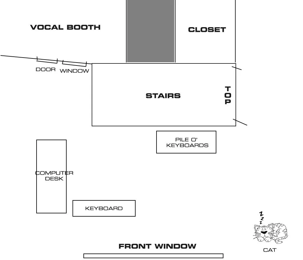 Today I worked on the blueprint for the wall I'm gonna build up there to create a vocal booth. Initially I was going to build something small in the "nook" of the back corner of the room (the part to the left of the gray area, which is actually a little larger and squarer), but I decided to make it go all the way across for a couple reasons. 1) that whole area of the room is going to be kind of wasted anyway; the bulk of my setup will be in the big part of the room, and 2) any small room, especially one not much bigger than a phone booth is going to sound awful. I know the majority of people reading this aren't musician/engineer types so this is about to get either super boring or really interesting depending upon how much you like to don your Mr. Science hat...